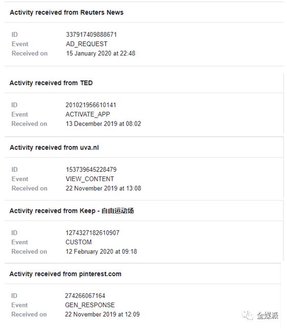 Off-Facebook activity和Ad Preferences的相关内容都放在ads_and_businesses这个文件夹里,点开就能看到几十个后缀为.html的文件,每个文件都是一个第三方平台发送的数据。数据以时间作为标签排序,被分为申请广告(AD_REQUEST)、打开app(ACTIVATE_APP)、浏览内容(VIEW_CONTENT)、定制(CUSTOM)、生成回应(GEN_RESPONSE)等不同的功能板块。
