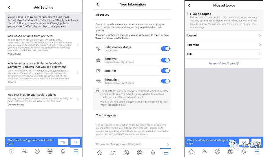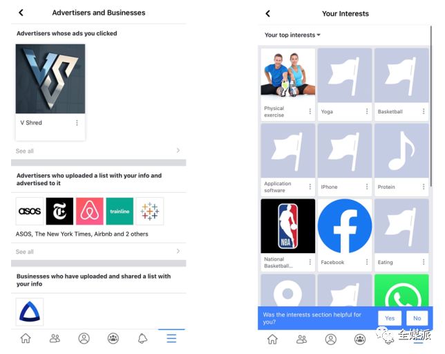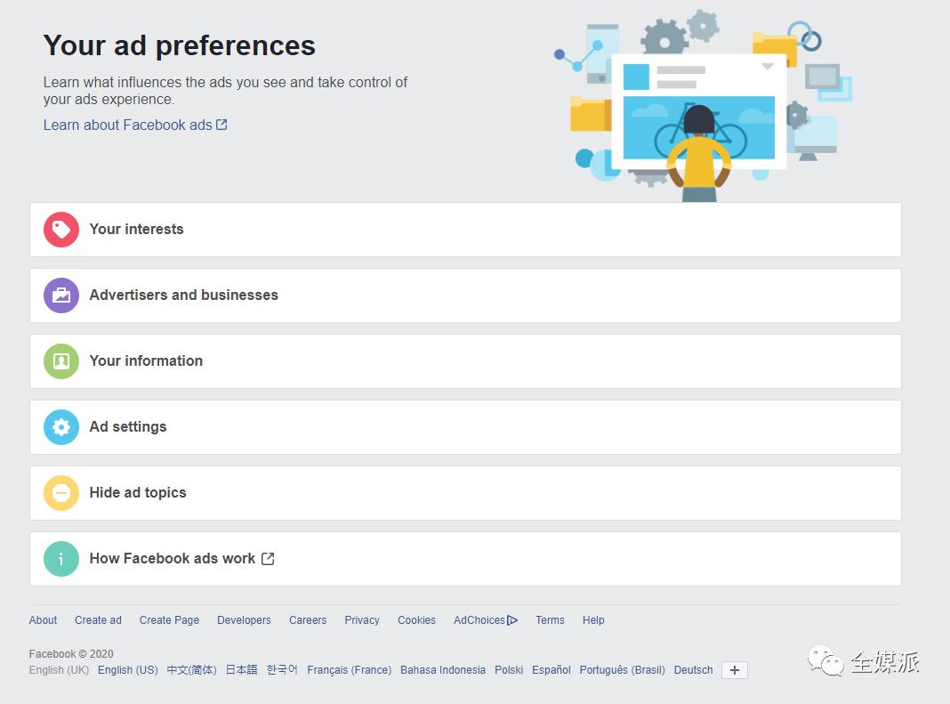 Facebook以外的平台数据尚且如此,发生在产品内部的种种用户行为,自然逃不过平台的天眼。想了解后者,我们可以将目光转向Facebook设置中的另一个功能——广告偏好(Ad Preferences),这是该平台向用户公开自身数据使用的另一尝试。