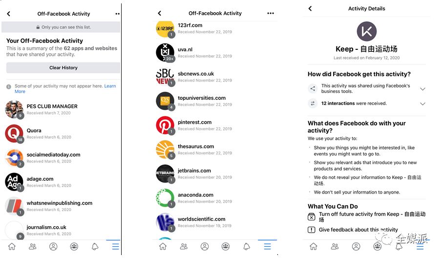 首先来看off-Facebook activity。对于多数用户来说,它是帮助了解平台收集数据功能的敲门砖。该功能会让你知道,有哪些第三方软件和网页向Facebook发送了你的使用信息。而且,只要设备曾登录过相应帐号,在用户并没有运行Facebook的情况下,该软件也能源源不断收到用户所用设备上各种第三方软件的使用数据。