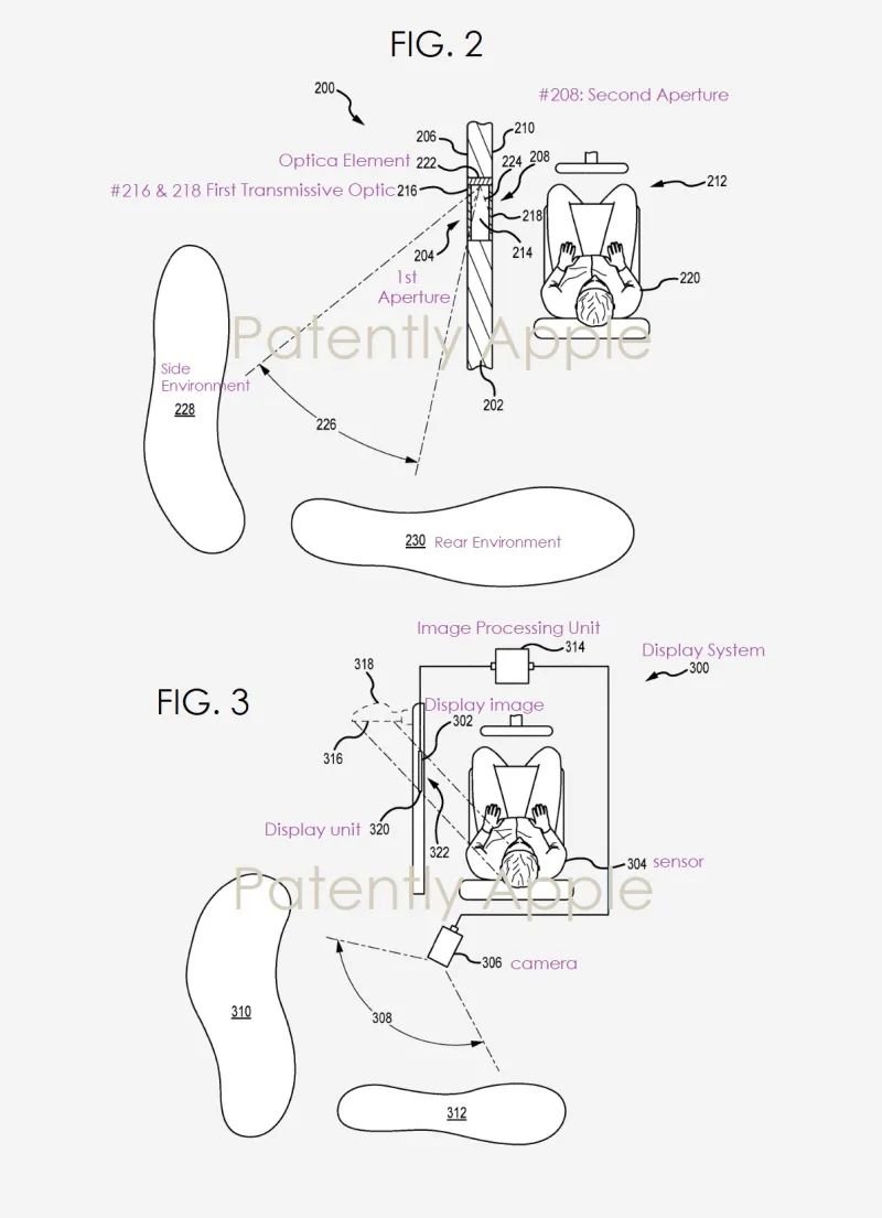 此外,还有一项车辆互联技术非常有趣。苹果希望将外部后视镜的图像投射到侧窗或抬头显示HUD当中。