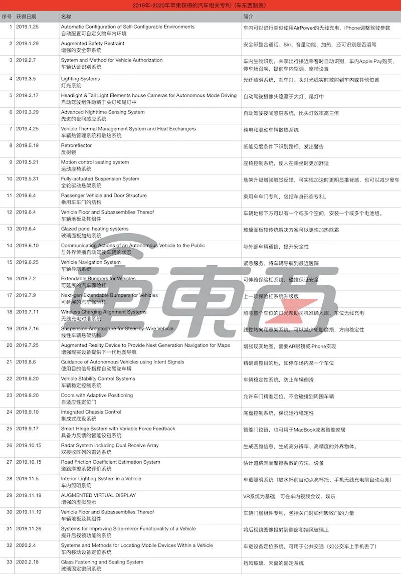车东西汇总了2019年以来苹果在汽车领域获得的30多项专利,涉及自动驾驶、AR导航、车载VR、车内支付、生物识别、智能硬件、车外交互、虚拟后视镜等多个领域。