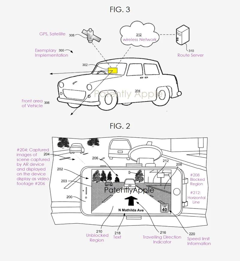 苹果在专利说明中表示:通过iPhone手机或者AR眼镜当中的摄像头,可以捕获前方的环境,并在屏幕上显示出路线和障碍物,这样就能实现更精准的车到引导和导航功能。