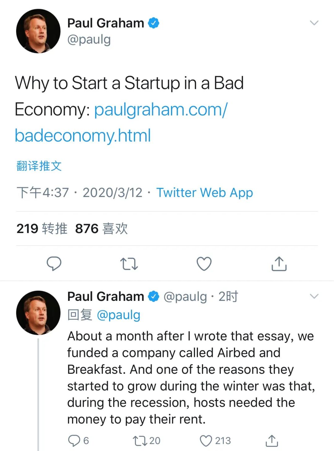 所以呢,萧条的时候可能确实是创业的好时机。很难说像竞争减少了这样的好处是否大过投资者不愿意投资这样的坏处。但两者其实都不太重要。对创业来说,人永远是最重要的。