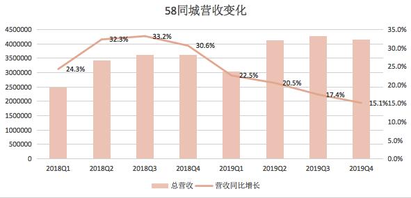 2019年第四季度,58同城实现营收41.6亿人民币,58同城董事长兼首席执行官姚劲波对此表示:“尽管宏观经济环境充满挑战,58同城四季度营收仍超过此前预期的上限。”