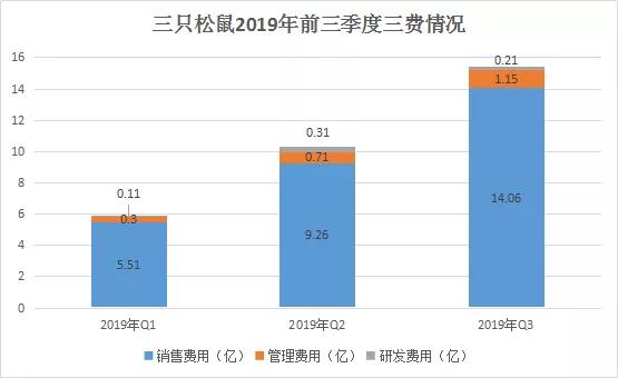 2019年前三季度,三只松鼠的费用情况逐渐走高,尤其是销售费用。据财报显示,三只松鼠在2019年前三季度的销售费用分别是5.51亿、9.26亿、14.06亿,整体呈上升态势。值得注意的是,三只松鼠在2019年三季度的销售费用高达14.09亿,同比增长49%,是同期净利润2.96亿的4.75倍。