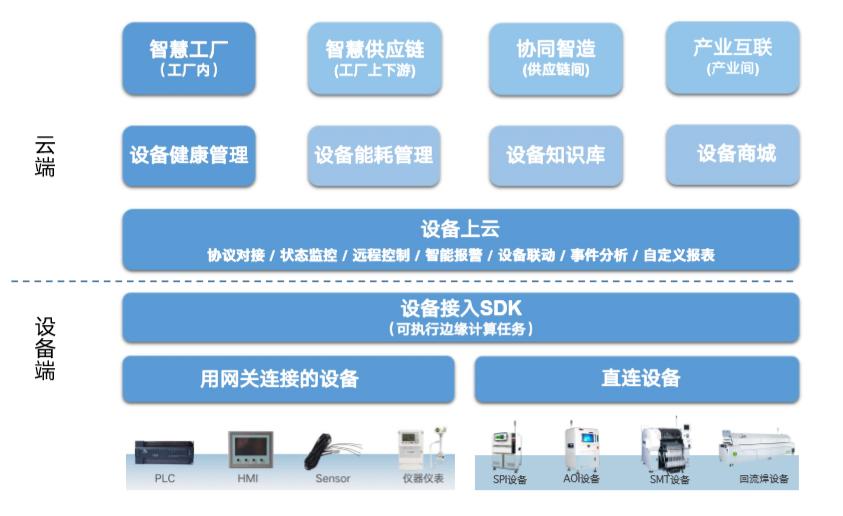 这里主要介绍一下智慧工厂解决方案,产品的核心技术在于高可用、高并发的底层架构,可支撑千万级数量的设备同时在线,配合上层针对不同业务场景开发的模块(目前在20个以上),满足客户根据业务需求的灵活配置。设备接入SDK后数据上传到云端,可实现对产线运行状态的远程监控、智能报警、设备联动、事件分析等,目前云端已完成开发的健康管理系统可通过创建工单的形式方便企业用户设置检测周期并处理设备维护问题。覆盖的设备包括从前期基板生产到后期的贴片,例如测试机、贴片机、印刷机、冲压机等。用户可以在PC端和小程度上进行远程监控。