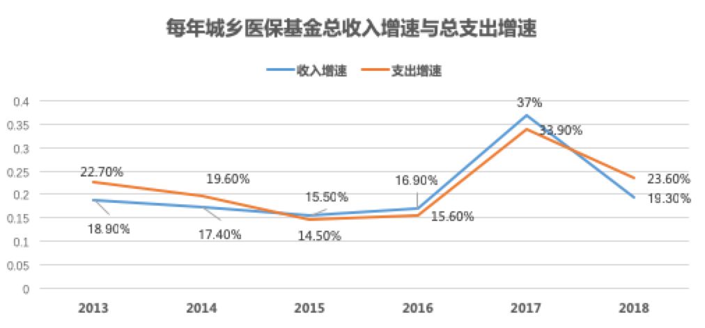截止到 2019 年,我国实现 95% 以上的医保覆盖率,医疗总支出逐渐增加。而每年的医保基金收入增速大多数情况低于医保基金支出增速,这给整个医保基金带来很大的压力。