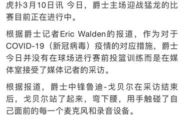 而作为北美四大体育联盟之一的NBA,每座球馆规模都在数万人,在目前这种情况下存在大面积交叉感染的可能性。因此,在昨日爵士队与雷霆队的比赛之前,NBA官方已经在考虑出台措施应对当前的疫情,只是没想到情况会恶化的如此之快。