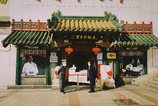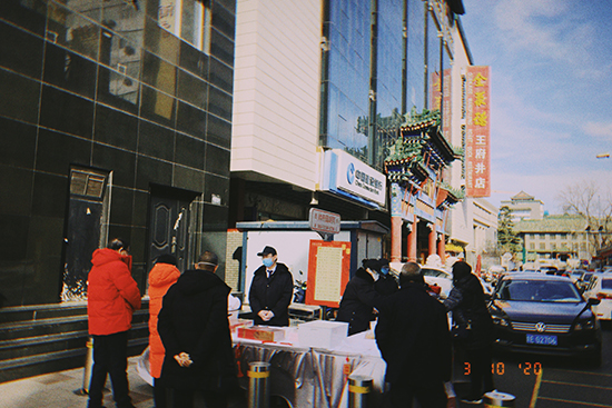 在王府井大街帅府园胡同9号,曾经一位难求的全聚德烤鸭店在门口摆起了外卖点,每天11:00至17:00销售,烤白薯10元一斤,糖花卷18元6个,还提供28元一杯的咖啡。售货员们戴着口罩鲜少吆喝,仍有不少游客驻足购买。