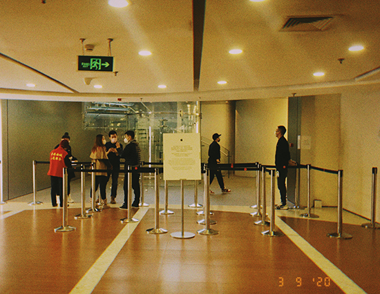 10:58,离开门还有两分钟,S馆门口的佳兆业广场上已聚集了三两人群等待入场。因为整个商场只开放一个入口,还需检测体温和登记个人信息,刚营业的门口排起了十人左右的队。