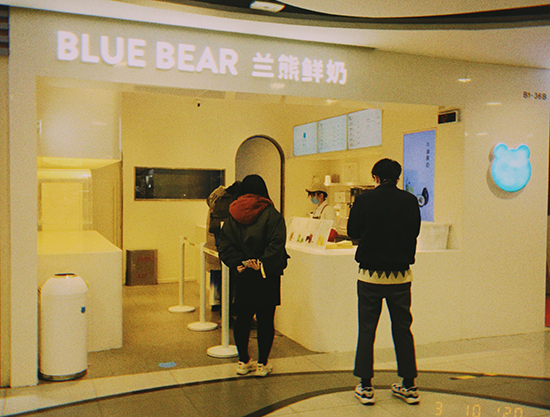 蓝熊鲜奶是2019年需要排队的奶茶店之一,即使在疫情期,午餐时段的店铺也时不时排起三五人的队。店员介绍,年前基本需要排队才能喝到,现在人没那么多。