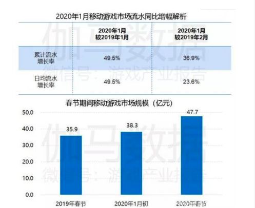 据第三方研究机构伽马数据显示,2020年1月相比于2019年1月,累计流水/日均流水增长49.5%,2020年春节游戏移动市场的规模达到了47.7亿元。
