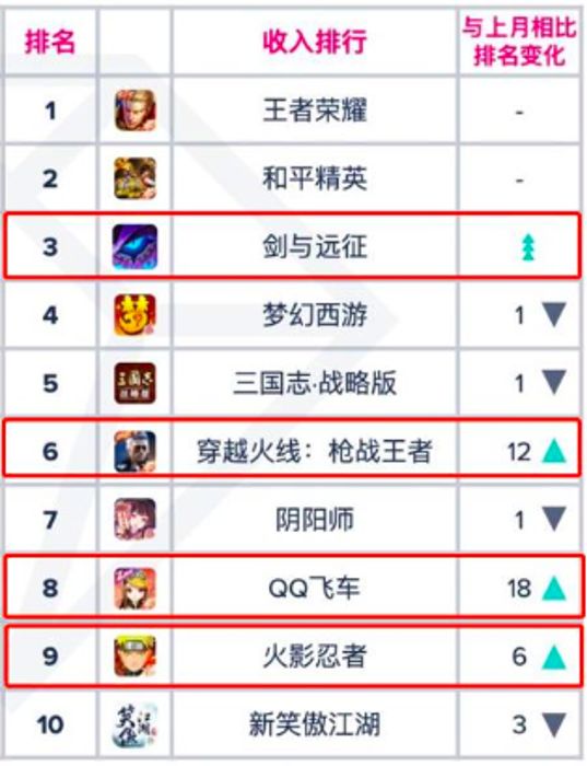 据APP Annie 发布的中国 App Store 1月收入榜中,1月中国区iOS收入前十名分别是:《王者荣耀》、《和平精英》、《剑与远征》、《梦幻西游》、《三国志·战略版》、《穿越火线:枪战王者》、《阴阳师》、《QQ飞车》、《火影忍者》和《新笑傲江湖》。