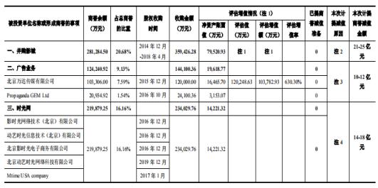根据公司公告,2019年累计计提了超50亿元的商誉减值,大致分为三块,其中并购影城计提的商誉减值在21-25亿元,广告业务在10-12亿元,时光网计提了14-18亿元。