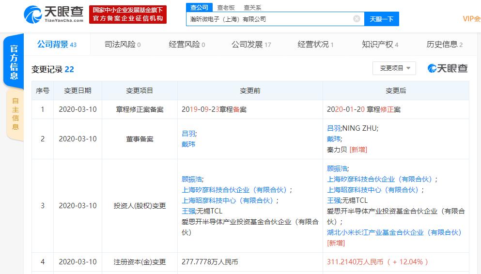 36氪获悉,天眼查数据显示,3月10日,湖北小米长江产业基金合伙企业(有限合伙)新增对外投资,入股瀚昕微电子(上海)有限公司,认缴出资约30.86万人民币,持股比例9.92%;此外,新增秦力贝为董事,其注册资本也从约278万增至约311万,增幅为12.04%。瀚昕微电子(上海)有限公司成立于2017年3月,法定代表人为王强,公司经营范围包括集成电路的研发、集成电路芯片的批发等。