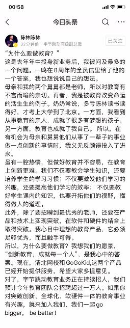 36氪获悉,3月13日凌晨,字节跳动高级副总裁陈林发布了一则微头条,详细阐释了字节跳动做教育的初衷、理念与愿景。陈林称,目前字节跳动教育业务仍在持续招人,今年将会招聘超过一万人,欢迎对突破创新、全球化、软硬件一体的教育事业有兴趣的优秀人才加入。此外,字节跳动全球CEO张一鸣在八周年的全员信中表示,教育业务将是他重点关注的新业务方向。他说:“接下来,我会重启对教育的访谈观察。”