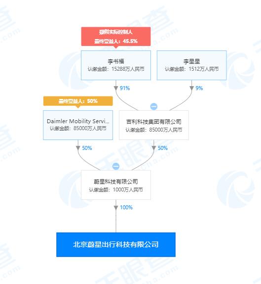 36氪获悉,天眼查数据显示,3月9日,北京蔚星出行科技有限公司成立,该公司注册资本1000万人民币,法定代表人为耀出行CEO顾涛,公司经营范围包括网络预约出租汽车经营;销售汽车、汽车配件等,该公司由蔚星科技有限公司全资控股。蔚星科技有限公司为耀出行的运营主体,公司两大股东分别为吉利科技集团有限公司和戴姆勒旗下移动服务公司Daimler Mobility Services GmbH,两者分别持股50%。
