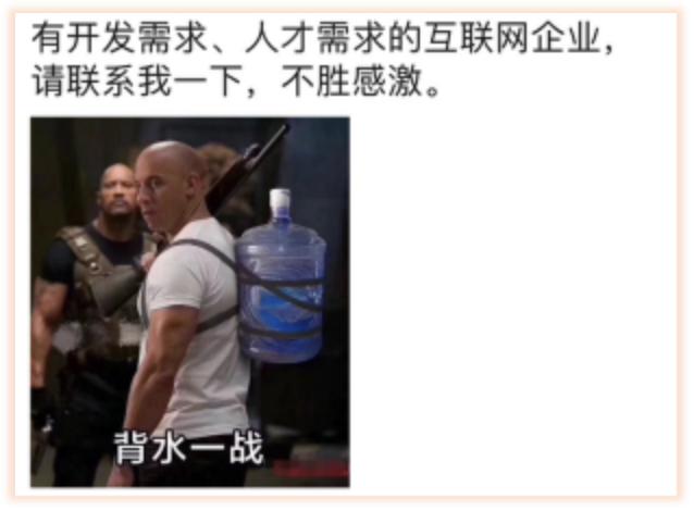 阿汤是深圳一家互联网创业公司的创始人,仔细翻看他的微信朋友圈,可以看到几乎每隔半天,就会重复出现上面这句“广告词”,并配以范·迪塞尔背着桶装水的照片——意为“背水一战”。