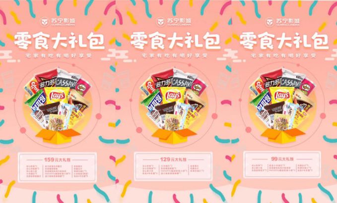 和其他院线通过团购、批发等简单粗暴的处理方式不同,多地的苏宁影城将食品分为99元、129元、159元档的套餐包,并给每一档位做了海报,然后统一在朋友圈和粉丝群发布。