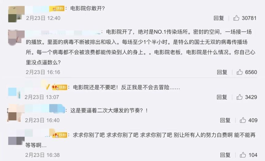 然而,二月底,影院准备复工的消息一出,随即质疑声起。承受着经济和舆论双重压力、进退两难的影院处境格外尴尬。