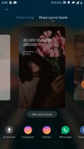 让他们不安的,是Resso看起来如此不同——在一些印度当地YouTuber上传的评测视频中,能看到除了和Spotify、Apple Music等等平台一样有歌曲搜索、分类推荐等等常规功能外,Resso对歌曲播放界面做了很大革新,该界面被放在了App首页,占据整个屏幕,用户可以直接在播放界面的醒目位置看到随音乐实时滚动的歌词,还可以根据喜好变换播放界面的背景——不论是静态图像,GIF动图还是视频片段(这个功能被叫做“Vibe”);界面下方则设计了转评赞按钮,用户可以评论歌曲,并将喜欢的歌曲连同歌词、背景生成分享卡片转发到其他社交平台;另外,Resso的切歌方式也不像一般的音乐流媒体那样需要左右滑动或是点击切歌键,而是上下滑动切换。
