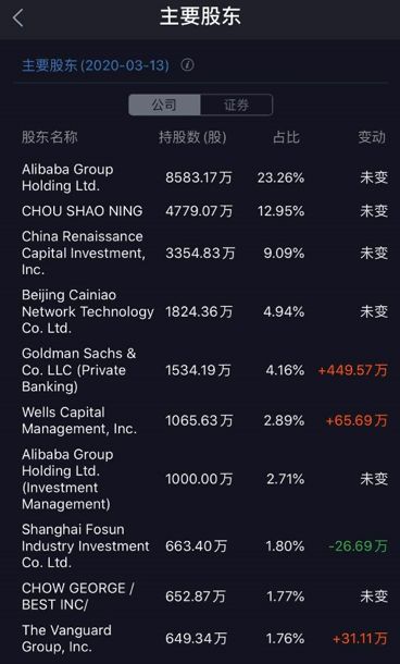 截止目前,阿里巴巴占百世集团股份超过23%,为公司第一大股东,超过创始人周韶宁13%的股权。