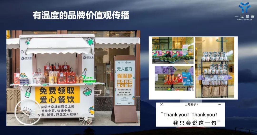 情感营销的时代,得人心者得天下,企业要做有温度的品牌,并打造与公众产生共情的人设。疫情期间我们看到上海的商场门口“爱心餐”,这是上海的环球港商城做的,让快递小哥、城管、环卫工人免费领取爱心餐饮,彰显了品牌的温度,产生强烈共情和情感共鸣。在这样的热点话题下,品牌也收获了很多忠实顾客的心, 实现价值双赢。