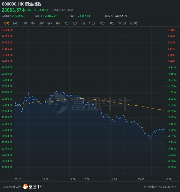 富途资讯3月16日 | 恒指午后拉持续走低,交投热度极具恐慌,个股集体重挫。截至收盘,恒生指数跌4.03%,报23063.57点;国企指数跌4.38%,报9227.6点。主板全天成交1588亿港元,较上个交易日小幅减少。