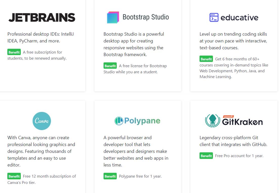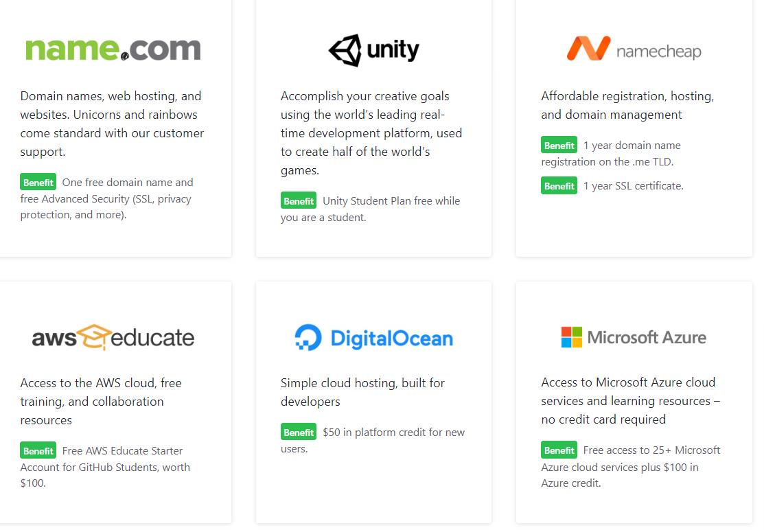 针对学生端的版块GitHub Student Developer Pack类似于一个app商店,平台上的app开发者不乏微软和GitHub这样的大厂,但大部分仍然是中小型企业开发的应用。工具类型包含免费域名创建、云存储、图表制作、编程课程等多样类型,形成了以GitHub为核心的编程学习app生态圈。学生用户经过简单的学生认证和学生信息上传,即可免费使用海量工具。
