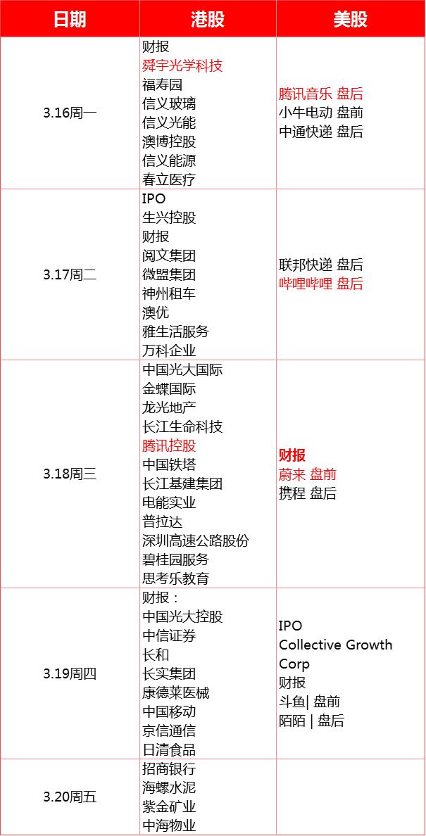 本周将在港美股市场上将迎来多家公司的重磅财报发布。其中港股市场上关注度较高的有国内领先的光学产品制造企业舜宇光学科技、国内互联网游戏与社交龙头腾讯控股等。