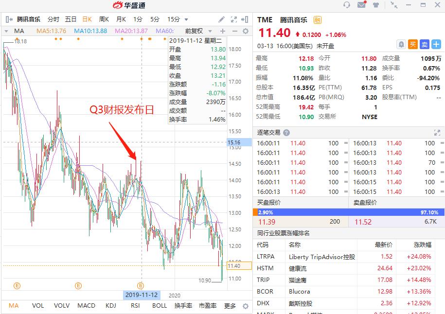 财报发布后,股价表现比较弱势,整体上看从11月11日收盘价14.37美元至今11.40美元,腾讯音乐的股价在区间内下跌20.67%。2019年全年,腾讯音乐的股价跌幅达11.2%。