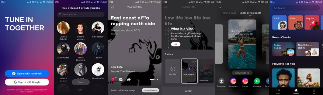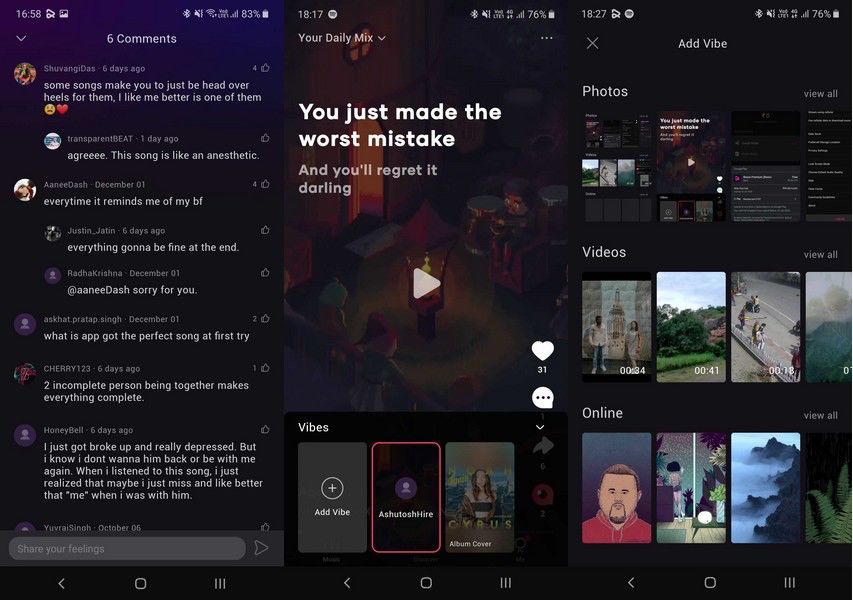 Resso主打四个功能:评论(Comments)、歌词引用(Lyric Quotes)、歌词效果(Lyrics Effects)和气氛(Vibes),这几个功能都围绕着“社交分享”开展,而这也正是目前流媒体市场缺少的。前三个功能虽已在国内各大音乐平台成为常见而普遍的功能,但海外音乐巨头Spotify却至今都没有推出歌词功能,而苹果音乐也是才刚支持歌词同步功能不久。