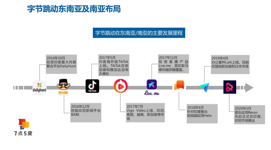 紧接着一个月后,2016年10月,字节跳动投资印度最大的新闻聚合平台——被称为“印度版今日头条”的Dailyhunt。2016年12月,字节跳动控股印尼新闻推荐阅读平台BABE,而这也正说明字节跳动在布局海外市场时,开始发力东南亚和南亚了。不过2016年的字节跳动,不管是在印度的投资还是在印尼的收购,主要都是围绕资讯类的图文产品。