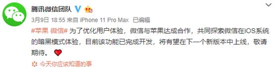 据媒体报道,苹果对App Store 商店的审核做了更新。如微信坚持不开发夜间模式,或将面临下架。目前,微信回应称已与苹果达成合作,该功能有望在下一版本中上线。