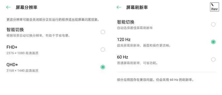 当然这里也有例外,比如 OPPO 在 Find X2 Pro 当中就提供了 120Hz 和 QHD+ 分辨率共同开启的可选项,这是目前唯一一款能提供这种显示组合的手机。