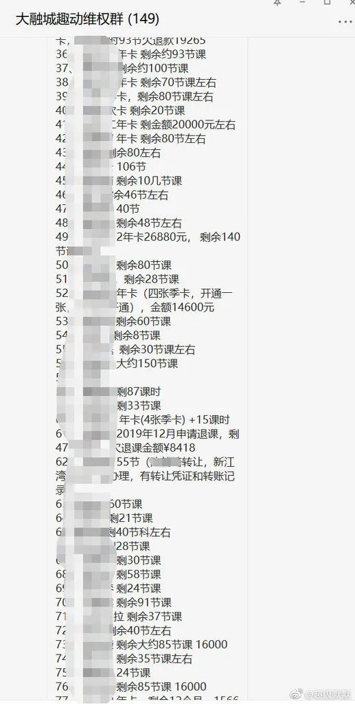 据懒熊体育了解,在随后很短的时间内,家长们自发组建了微信群,统计剩余课时及金额。截至发稿,已有北京、唐山、上海等地家长建立了数个维权群,涉及人数已超过2000人,仅北京一家门店就有400人在等待维权。其中,不少家长均是购买了年卡或课时包,剩余课时数在30节到190节课不等,课时单价在200元上下,更有甚者,则是刚刚在今年2月购买了尚未使用的年卡。