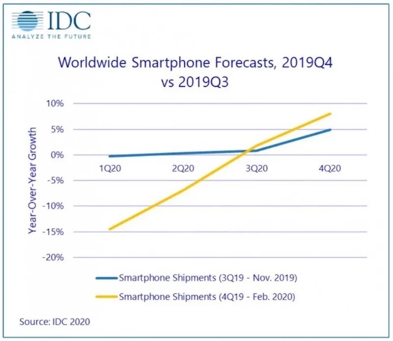 原本就因为技术迭代更新太快消费周期延长而有些萎靡的智能手机市场更是雪上加霜。2019年IDC曾预计,由于5G开始商用,中国智能手机市场将在2020年恢复增长,同比增长0.7%。