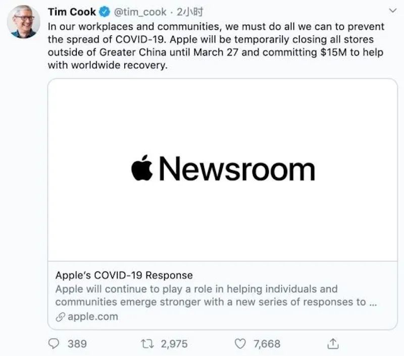 但最近这种情况却发生了逆转,3月14日,苹果CEO库克在推特宣布,将关闭除大中华地区外所有的苹果门店。也就是说,全球511家苹果零售店现在只有位于中国的42家可以开门营业。