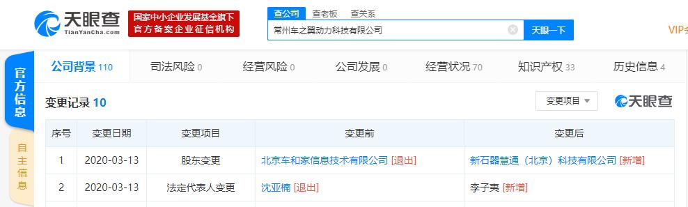 36氪获悉,天眼查数据显示,常州车之翼动力科技有限公司发生工商变更,理想汽车的运营主体北京车和家信息技术有限公司退出股东行列,新增新石器慧通(北京)科技有限公司为股东;此外,理想汽车联合创始人沈亚楠退出法定代表人,新石器慧通(北京)科技有限公司CFO李子夷接任。