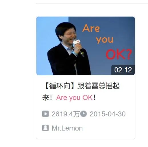2015年4月30日, UP主Mr.Lemon制作了一段时长为2分12秒的视频。视频的标题是《【循环向】跟着雷总摇起来!》,封面则是笑得眯起了眼的雷军,拿着话筒,空白处是手写体的“Are You OK?”
