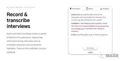 Weav是一款招聘语音分析软件,利用机器学习算法,记录、翻译、分析和提取招聘对话中的关键信息,提升招聘的速度和质量。其自然语言处理技术行业领先。同时计划建立招聘数据库,利用机器学习算法改变招聘方式。