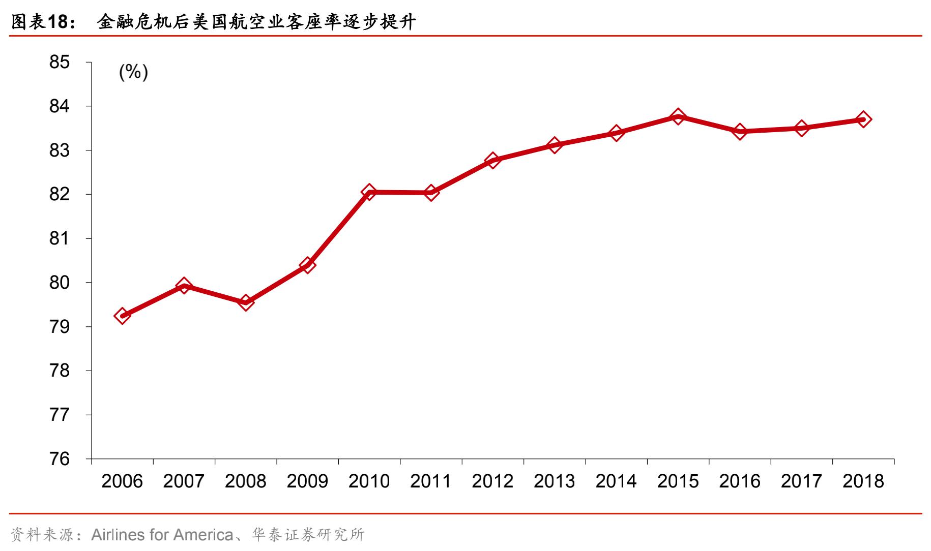 高度重叠的股东背景,使得美国航空业公司间的竞争态势趋弱,垄断特性更为严重,航司间的默契促使行业压低供给,更易与需求匹配,客座率在高位保持平稳,收益水平持续增长,提升盈利稳定性。