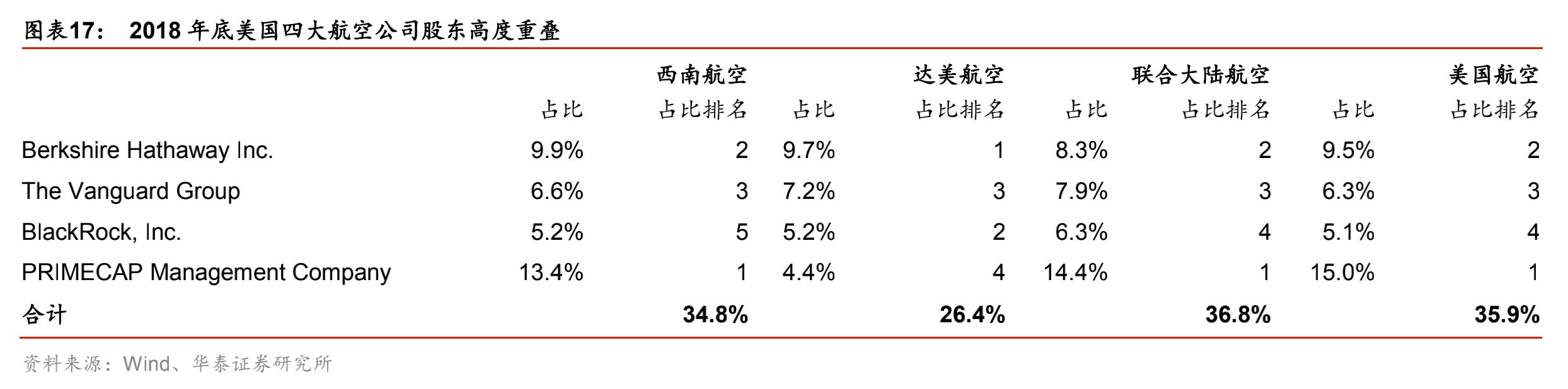美国航空业经过百年发展,已经形成了一个垄断程度非常高的局面,供需结构与盈利基本稳定。而且,四大航空公司(达美航空、美国航空、联合航空、西南航空)不仅有表面上的寡头垄断,背后的股东还具有高度的重叠性,使得公司供给间默契程度更高,进一步提升了盈利稳定性。