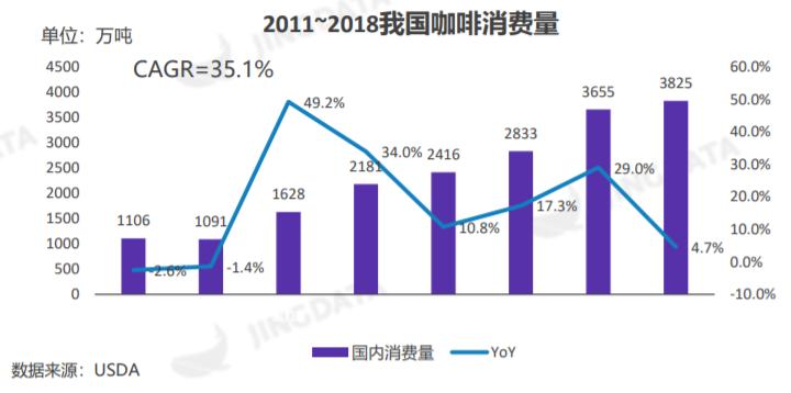 鲸准研究院根据美国农业部数据显示,我国咖啡消费量2011 年-2017年的复合增长率为35.1%[1],呈快速增长模式。