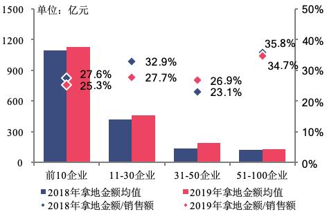 百强企业拿地态度谨慎,拿地金额占销售额比重延续下降趋势。2019年,50家百强代表企业拿地金额占销售额比重较上年降低2.7个百分点至26.7%。前10企业及11-30企业的拿地金额占销售额比重则分别降低2.3个、5.2个百分点至25.3%、27.7%;31-50企业是拿地金额占销售额比重出现增长的唯一层级,其比重较上年增长3.8个百分点至26.9%;51-100企业的拿地金额占销售额比重为34.7%,较上年降低1.1个百分点。
