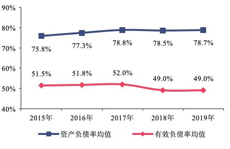 百强企业由“去杠杆”转为“稳杠杆”,负债水平仍处于高位。2019年,百强企业资产负债率均值为78.7%,较上年微增0.2个百分点;剔除预收账款后,有效负债率均值为49.0%,与上年保持持平,百强企业整体负债水平保持稳定。从债务期限结构来看,百强企业债务期限结构略有改善,短债长债比较上年略有下降0.01,其中,规模较大企业债务期限结构更为合理,前10企业短债长债比均值为0.40。而短期债务占比较高的企业应警惕短期内资金风险。