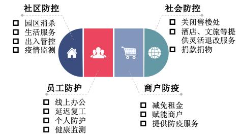 百强企业以人民生命安全为中心,采取各类疫情防控措施。物业服务是挡住疫情进入居民住宅的最后一道门,融创、保利等企业对小区进行全面消毒消杀、加强进出人员管控、加强防疫宣传工作,为业主提供防疫和便民服务,配合相关部门做好疫情排查工作,筑牢社区防疫墙;百强企业遵照防疫要求,为保证客户和城市防疫安全,关闭售楼处全力配合疫情防控,为租户减免租金,携手共度难关。此外,百强企业积极践行企业公民责任,捐赠各类物资支援抗疫,参与防疫设施建设贡献力量。