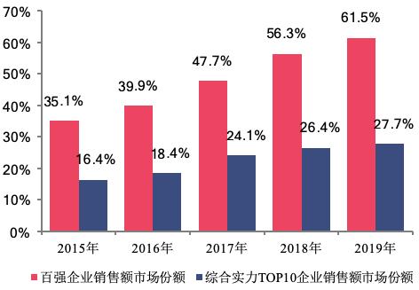 百强企业市场份额持续扩大至六成,行业集中度进一步提升。2019年,百强企业销售额市场份额稳步上升至61.5%,较上年提高5.2个百分点。其中,综合实力TOP10企业销售额市场份额为27.7%,较上年提高1.3个百分点。