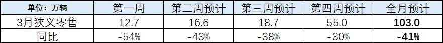 3月17日,乘联会发文称,3月厂商销售目标同比下降38%,2019年调研样本量占总体市场比例约为81%,通过该比例初步估算,3月狭义乘用车零售量大约为103万辆,同比约下滑四成,环比将大幅上升。