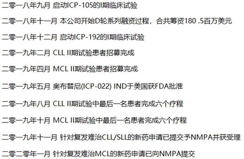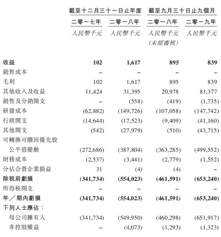 公司的产品尚未获准进行商业销售,公司尚未从产品销售产生收益。自成立以来的各年度内,公司概未盈利并产生经营亏损,截至 2017 年 12 月 31 日止年度及截至 2018年 12 月 31 日止年度,经营亏损分别为人民币 3.42 亿元及为人民币 5.54 亿元,且截至 2018年及 2019 年 6 月 30 日止 6 个月,经营亏损分别为人民币 2.79 亿元及人民币 3.22 亿元。公司绝大部分的经营亏损为可换股可赎回优先股、研发成本及行政开支公平值变动所致。